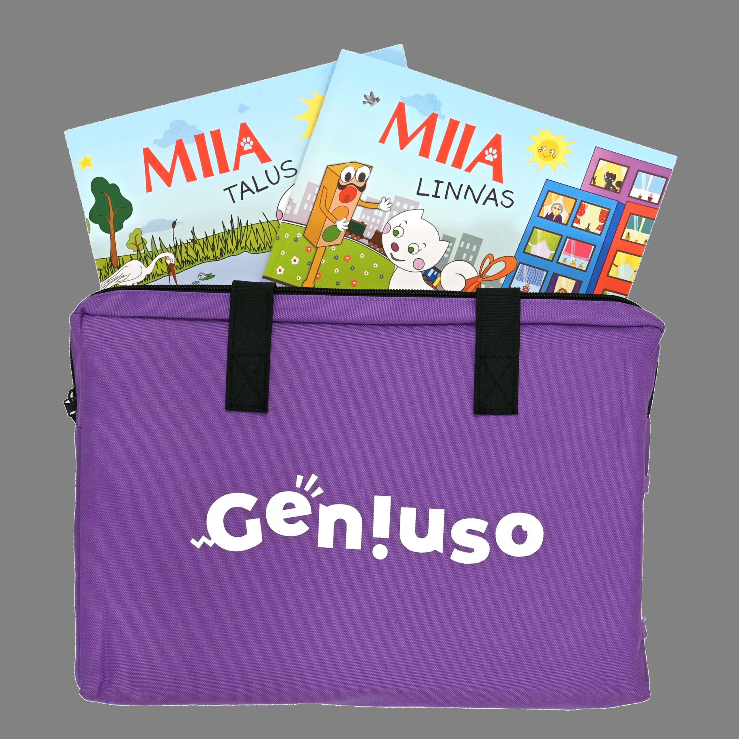 Geniuso MIIA kaks raamatut “Linnas” ja “Talus” koos kandekotiga on suunatud neile, kel on juba varasemalt seotatud Geniuso tarka pliiats koos TADA mitmekeelsete raamatutega. Funktsionaalne ja vastupidav kandekott mahutab mugavalt Geniuso targa pliiatsi, mõlemad MIIA raamatud ja kõik sinu olemasolevad TADA raamatud.