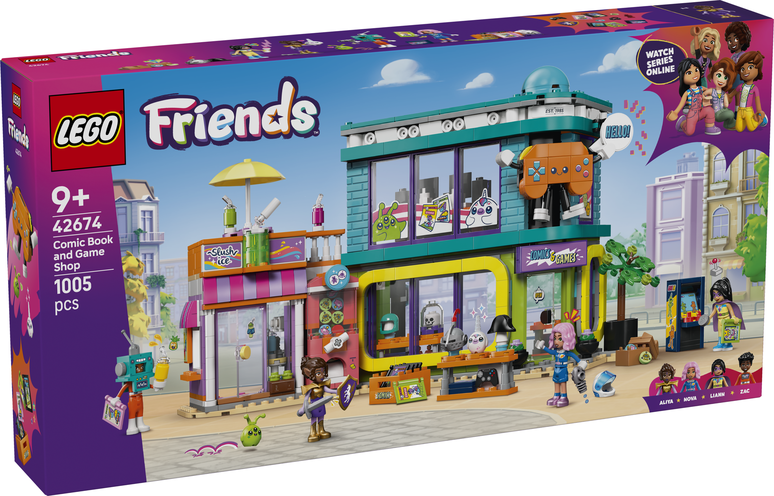 Ehituskomplekt noortele kangelastele – selles 9-aastastele ja vanematele tüdrukutele ja poistele mõeldud koomiksite ja mängude poes on 4 mininukku, tulnuka ja ükssarviku pehmed LEGO® osad ja tarvikud