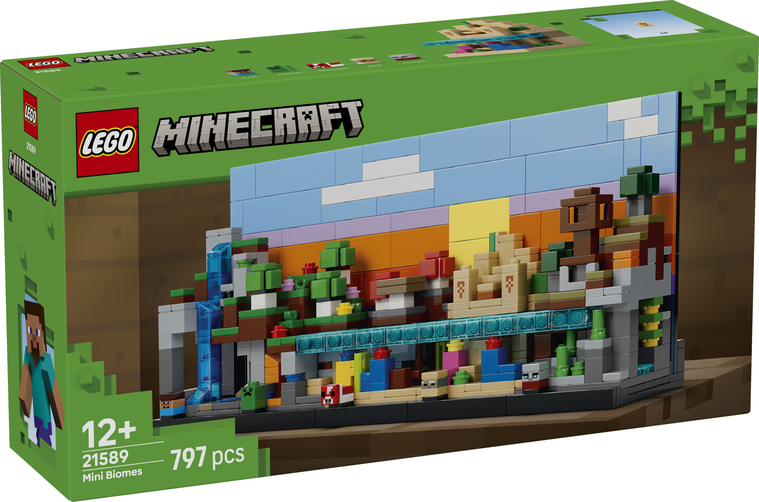 Kogutav MINECRAFT® komplekt – igal bioomil on autentsed detailid, nagu laava, kuld, kaktused, puud, kosk, koobas, korallriff, laevavrakk, tempel, kõrvits, ookean, rand ja aardekirst