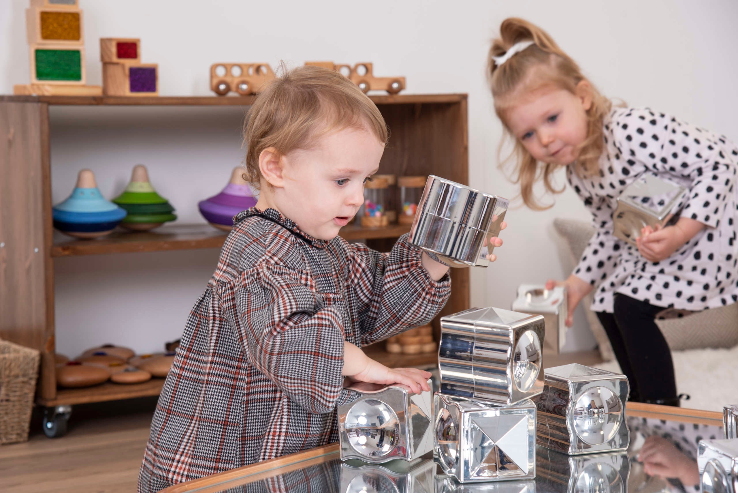 “TTS metalsed moonutavad kuubid toetavad visuaalset ja taktiilset avastamist peegeldava pinnaga, mis muudab peegelduse kuju. Laps märkab muutust, kui ta kuubikuid keerab, virnastab ja joondab.