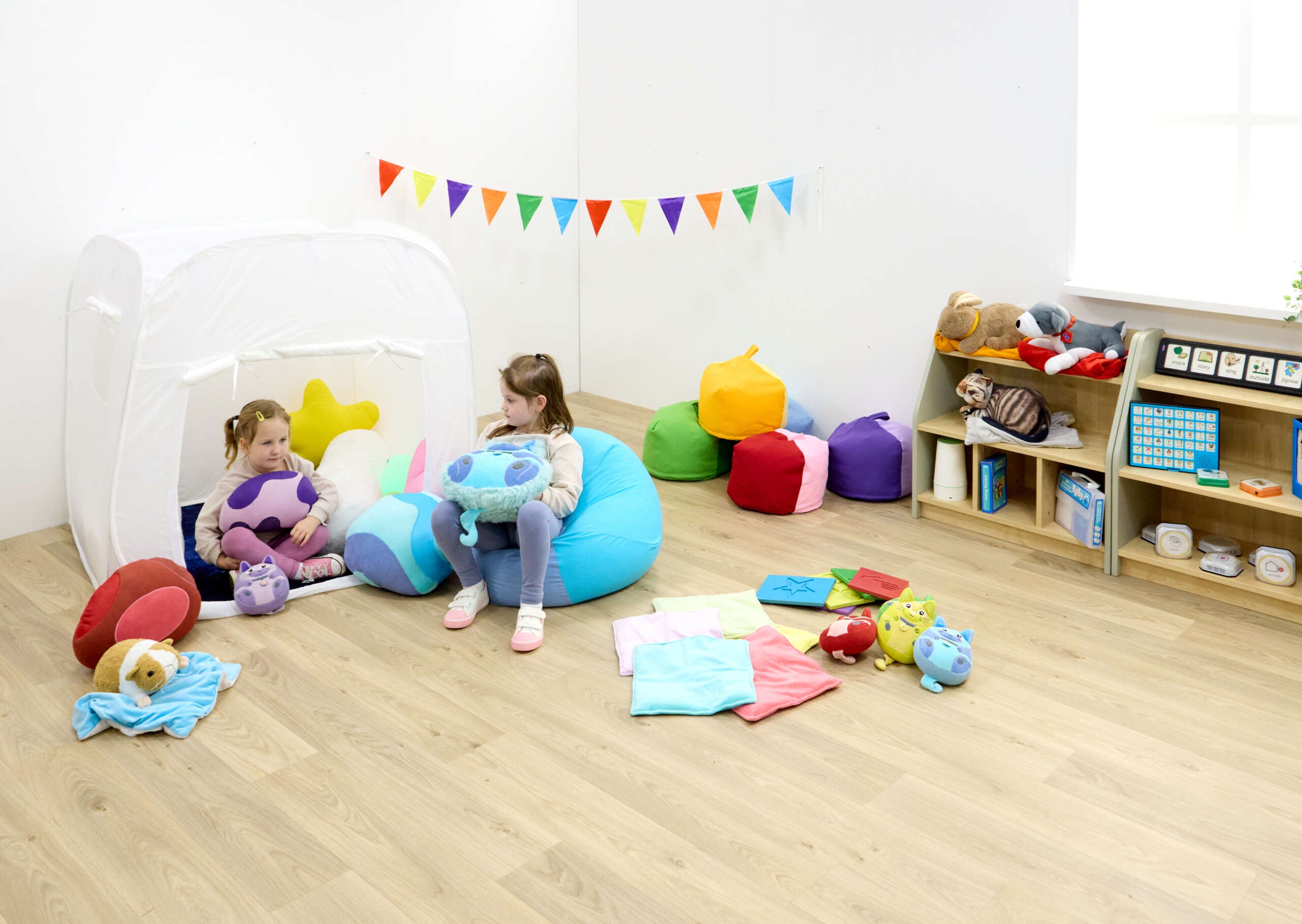 “TTS kolm sensoorset kaisupatja toetavad emotsionaalset eneseregulatsiooni õrna surve ja taktiilse sisendi kaudu. Laps saab patja kallistada, pigistada või sellel istuda, et rahuneda ja uuesti keskenduda. Komplektis on eri tekstuurid ja materjalid, mis toetavad sensoorse kogemuse avastamist ja sensoorse töötluse oskusi. Padjad on kerged ning sobivad rahunemisala, tunnetustoa ja klassiruumi kasutusse ning ka kodus õppimiseks.